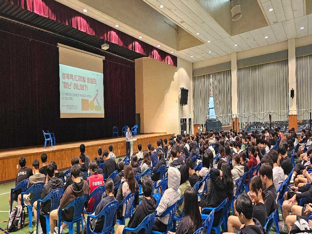 - 디지털 성폭력 예방교육 실시본교는 17일(수) 전교생을 대상으로 디지털 성폭력 예방교육을 실시하였습니다. 교육에 앞서 김호철 교장선생님께서는 최근 사회적으로 이슈가 되는 사례를 예로 들어 학생선수들에게 각별한 주의가 요구되는 폭력 사태에 대해 말씀해 주셨습니다. 이번 강의는 강사의 일방적인 전달식 교육이 아니라, 무대 위에서 학생들과 직접 대화를 나누고 다양한 사례를 공유하는 참여형 방식으로 진행되어 학생들에게 더욱 의미 있는 시간이 되었습니다. 경기체육고등학교는 앞으로도 학교 폭력 없는 안전한 교육 환경을 만들기 위해 교육가족 모두가 함께 노력해 나가겠습니다.
