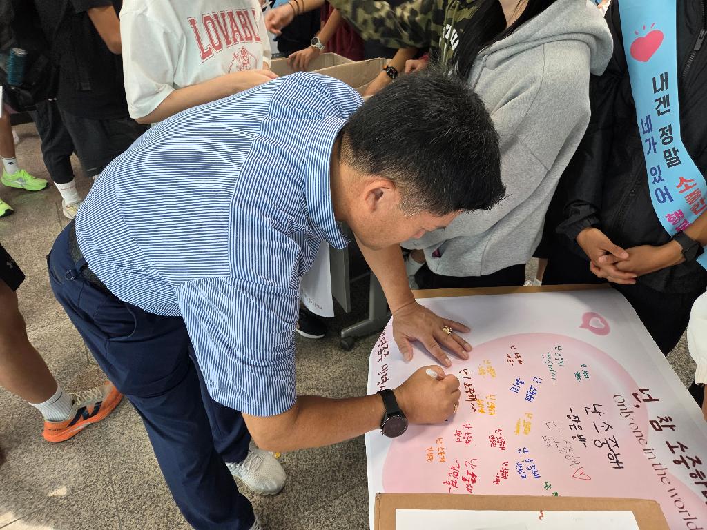 - < 2025학년도 2학기 생명존중생명사랑 주간>< 2025학년도 2학기 생명존중생명사랑 주간> 9월 23일 오전 " 생명존중 메시지 복권긁기 체험부스" 활동을 통해 ' 나의 소중함' ' 나의 존재가 이미 1등' 이라는 메시지가 담긴 활동을 통해 생명에 소중함을 즐거운 체험 함께 배우는 시간이었습니다. '난 소중해'를 쓰시면서 교장 선생님도 학생들의 체험 활동에 적극 참여해주셨습니다. 경기체중고 학생회, 또래상담 동아리, 자원봉사학생들이 함께 참여하였습니다.